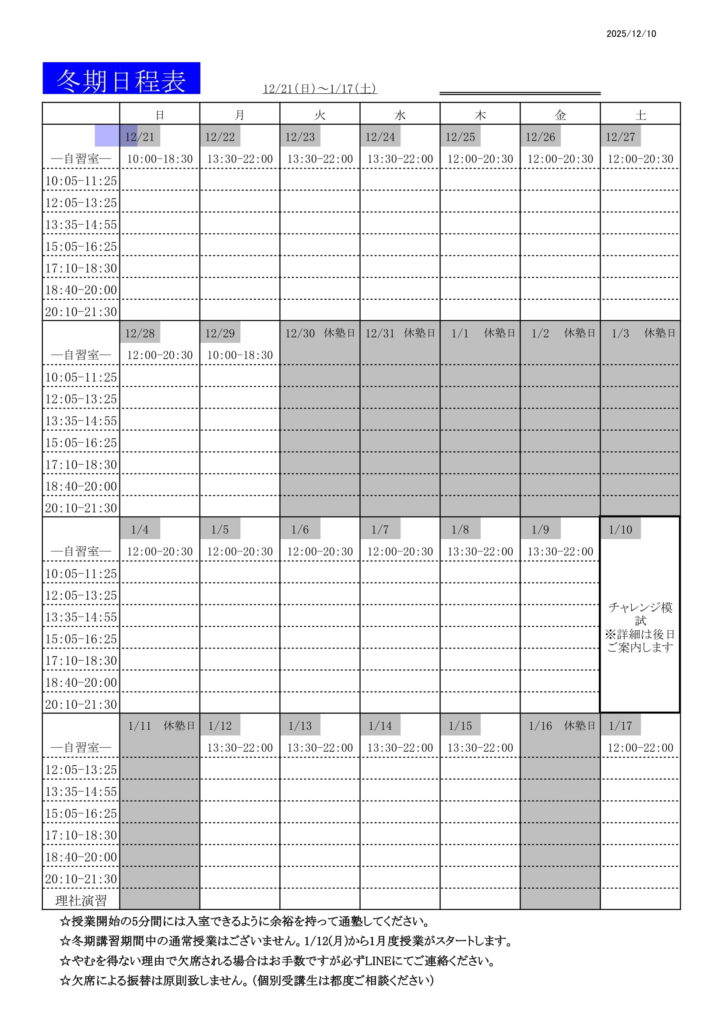 以下に冬期講習期間の自習室開放予定をまとめました。