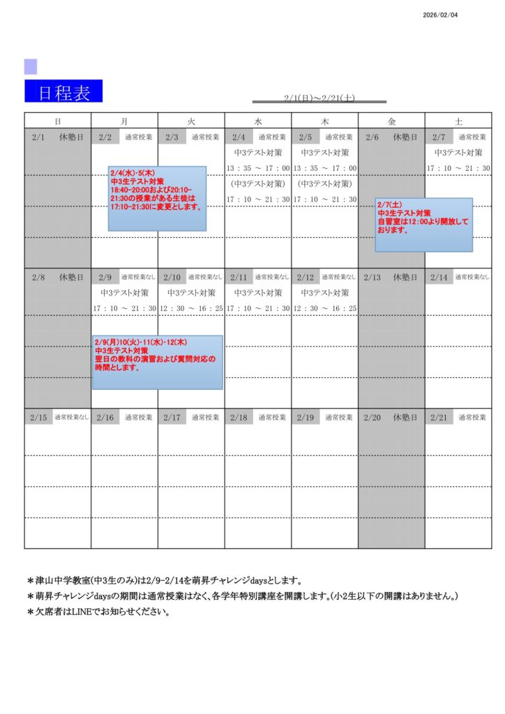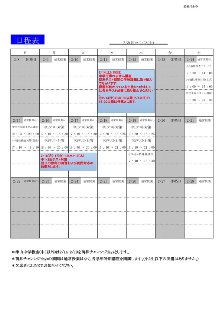 学年末テストに向けた対策日程をお知らせします。