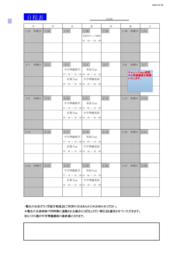 小学6年生 (対象:小6生、(小6生は特別講座はなく、中学準備講座をおこないます。))