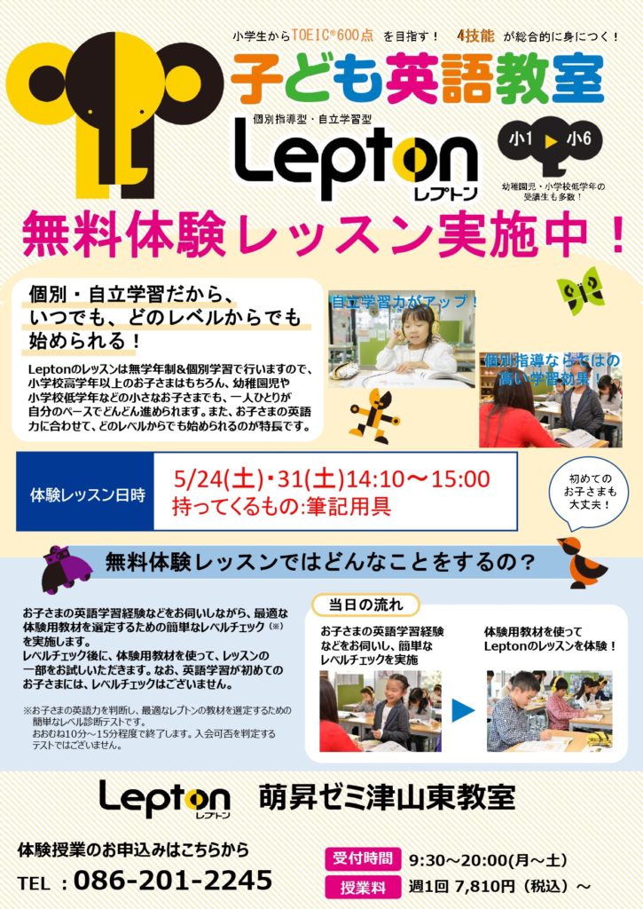 子どもに英語を習わせたいけど、どの教室にしようかしら?とお考えの高野小学校区のみなさま。萌昇ゼミ津山東教室にはこども英語教室Leptonがあります。